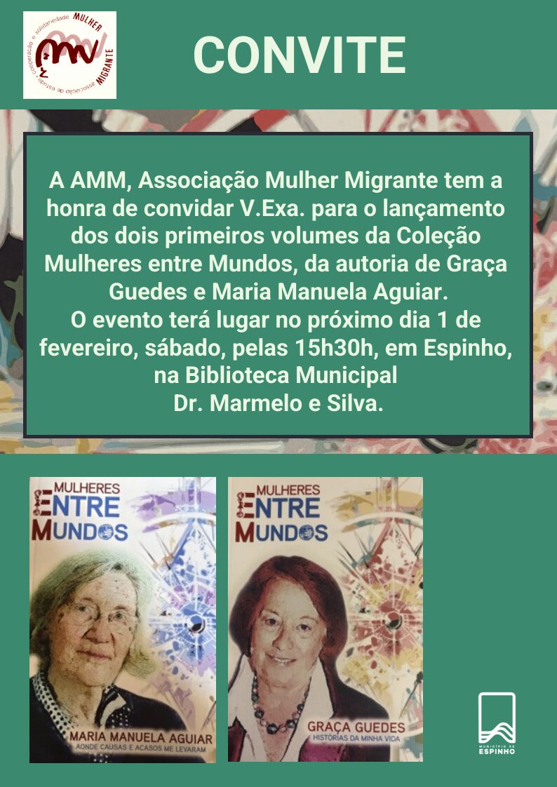 A AMM, Associação de Mulher Migrante tem a honra de convidar V. Exa. para o lançamento dos dois primeiros volumes da coleção “Mulheres entre Mundos”, da autoria de Graça Guedes e Maria Manuela Aguiar.