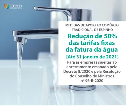 3. Redução da taxa fixa de consumo de água, saneamento e RSU em 50% até 31 de janeiro de 2021, para estabelecimentos e empresas que obedeçam aos critérios já sinalizados pelo governo, de acordo com os CAE`s.