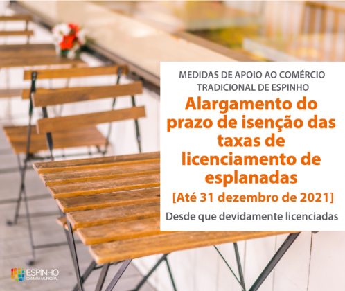4. Isenção de taxas de licenciamento de esplanadas até ao final do próximo ano, desde que estejam devidamente licenciadas pelas entidades competentes.