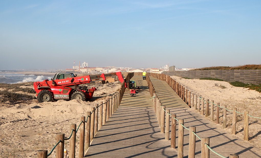 Esta intervenção, iniciada em 2019, contempla a substituição de cerca de 700 metros lineares e a colocação de regeneradores dunares que irão servir de obstáculo ao deslocamento pontual das partículas de areia para o passadiço.