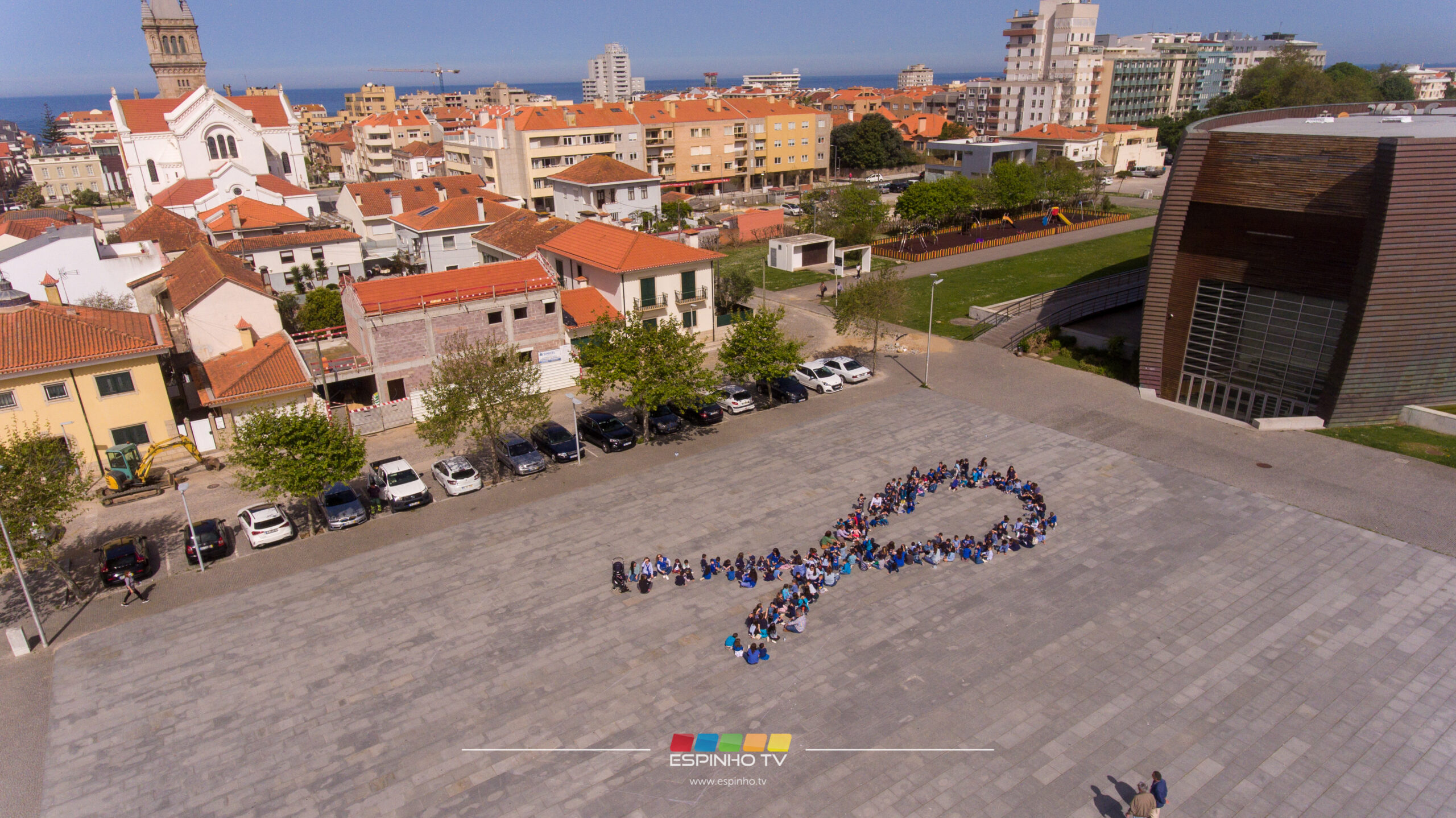 A praça junto ao Centro Multimeios de Espinho foi palco para a construção de um laço azul humano, uma iniciativa cívica que pretende alertar a comunidade para a prevenção dos maus tratos na infância.