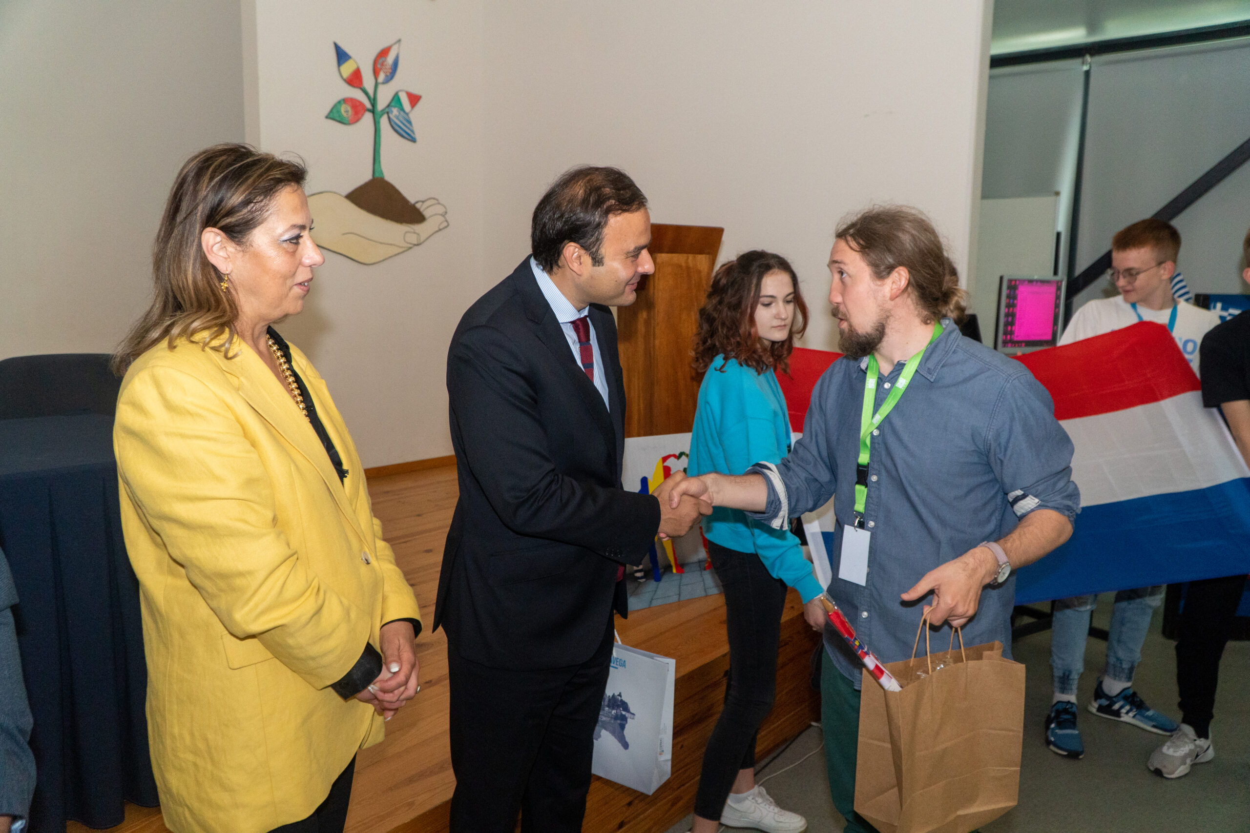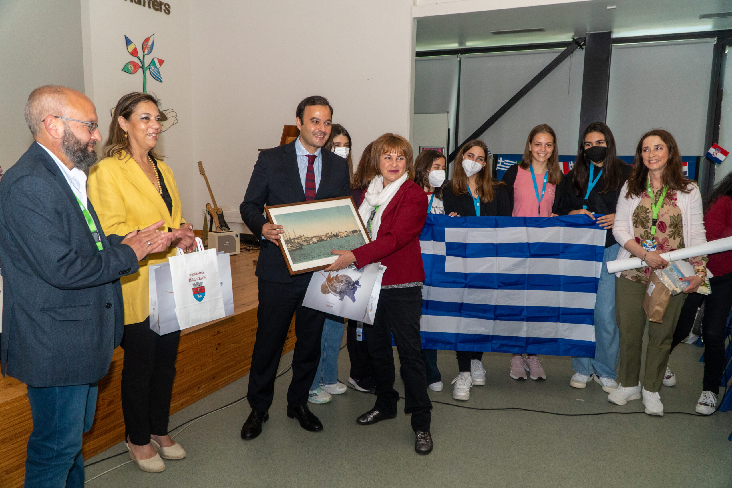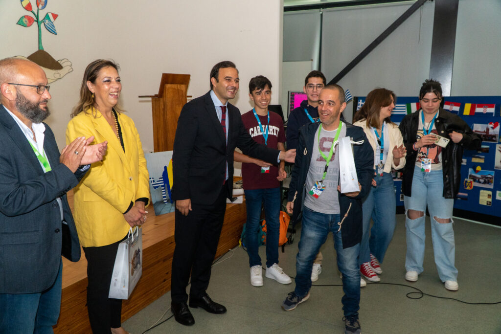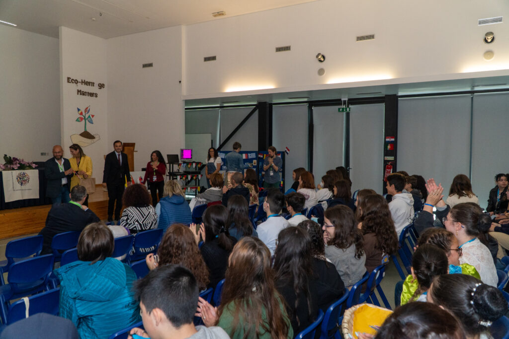 No auditório da escola, procedeu-se às apresentações dos parceiros ao Presidente da Câmara e à Vereadora da Educação, bem como ao Diretor do agrupamento e à Presidente do Conselho Geral, seguidas de troca de lembranças, apresentações das escolas pelos alunos visitantes, e dois momentos musicais e dançantes preparados pelos alunos Davi dos Passos (9º3) e Mónica Vieira (9º4). Depois do coffee-break, gentilmente oferecido pelos Encarregados de Educação Portugueses, plantou-se um vaso multinacional com sementes dos vários países.